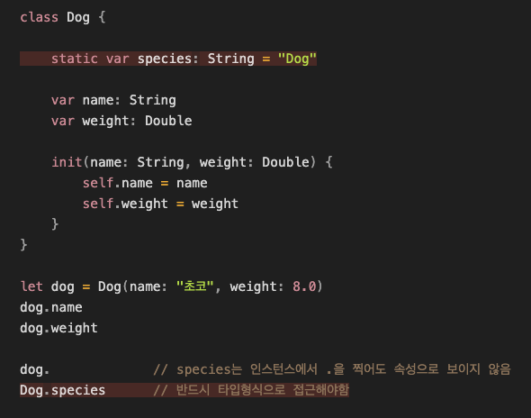 공유해야하는 성격에 가까운 저장속성을 저장 타입 속성으로 선언합니다.