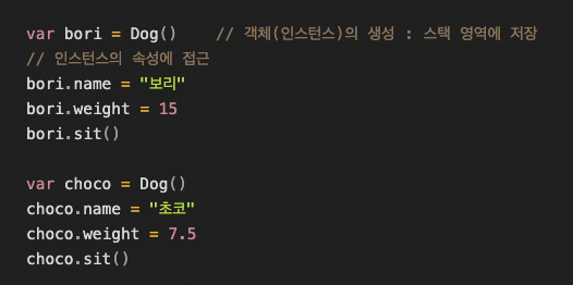 그리고 위와같이 Dog구조체를 이용하여 인스턴스를 생성해줄 수 있습니다.