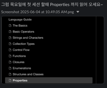 시작 전 멘토님께서 Swift 공식 Document를 가지고 수업을 진행하자고 말씀해 주셨고, 읽어 오라고 숙제를 내주셨다.