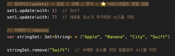삭제(remove)는 해당 키(Key)에 대한 값(Value)이 없으면 nil을 리턴하기에 따로 존재합니다.