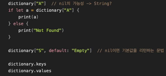 해당 키(Key)값이 없을 가능성이 있기 때문에, 옵셔널(Optional)로 반환이 됩니다.
